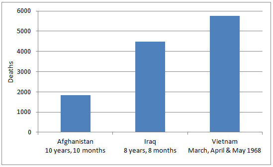 When comparing the monthly death counts of Afghanistan and Vietnam I found myself wondering if the degree of carnage in Vietnam accelerated our eventual exit. Are Americans complacent towards Afghanistan because there are “only” scores of deaths each month instead of the thousands seen in Vietnam? Is that what it takes? Did we learn nothing from that experience that can be applied to our current involvement in Afghanistan? How would our policy in Afghanistan be different if there were 500 deaths last week and there was a draft that put all families in jeopardy of losing a family member? Somehow I think we would have left Afghanistan many years and lives ago.