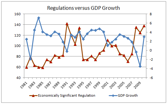 However, the same website, The Office of Information and Regulatory Affairs, has a different set of reports beginning in 1981 that also looks at economically significant regulations. These reports provide historical context to the regulation story that is critical to interpreting the limited data set presented in the Wall Street Journal article and clearly shows there was greater regulatory activity from 1991 to 1994 that in the Obama years. During that period of “high government regulation” there was also healthy growth in GDP as the country emerged from the 1990 recession.