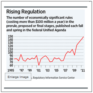 Although the Wall Street Journal article has many flaws perhaps the greatest is that it attempts to portray correlation as causation – a cardinal sin of statistical inference. To attempt to assign causality to current regulatory activity for the sluggish economic growth is fundamentally flawed.