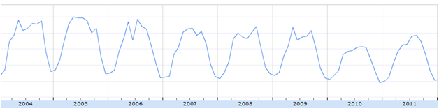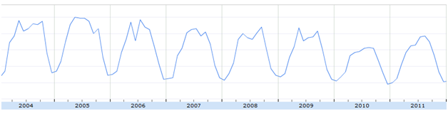 On a tangential observation, using Google Insight can lead to interesting and unexpected observations. Not surprisingly, the heat map below shows Google searches for “fire ants” to be focused in the Southeast where most of the pesky creatures live. The second chart shows the search volumes over time. Notice the annual bimodal distribution. Although I’m no entomologist it only took a few minutes of searching to discover that fire ants are most active in fall and spring when daytime temperatures are between 70 and 85 degrees Fahrenheit. The search distribution matches this fact rather closely.