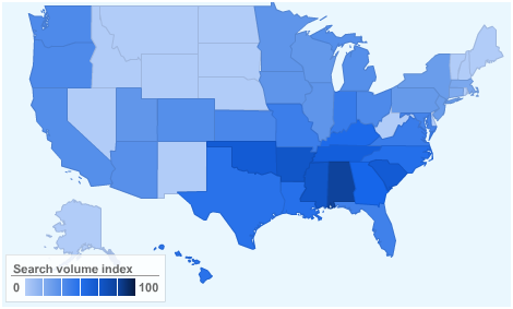 Building off of the Calamities of Nature concept I used Google Insights to inspect search volumes for various search terms. In addition to a numerical output a heat map is generated showing the density of terms by state. For example, searching for a widely known term such as “Obama” returns a heat map with near uniform density indicating that no state has a greater volume of searches than another. The map below is the last 12 months of Google searched for “Obama”.