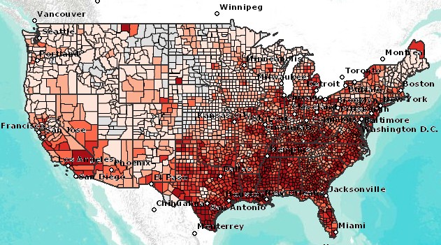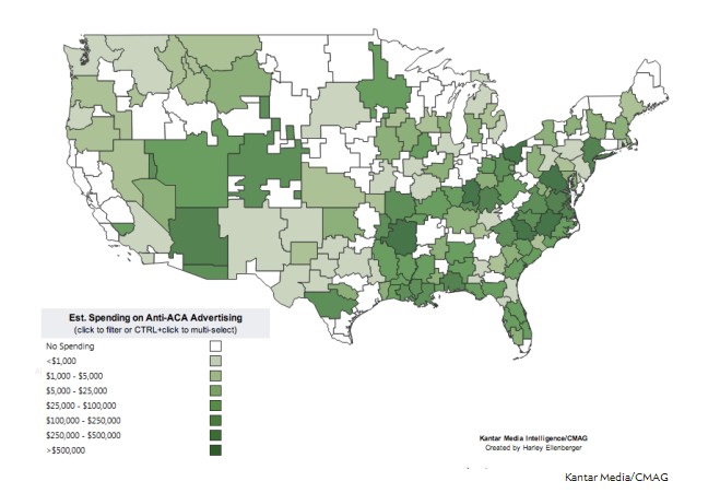 Kantar Media has created a map of the amount of money spent on anti-Obamacare advertising. The geographical distribution of the negative advertising is reminiscent of other maps of the incidence of obesity, diabetes, hypertension and even the distribution of the uninsured or underinsured.