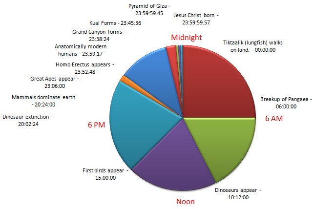 The following chart puts our temporal distortion in perspective. Assume we scale the last 400 million years to fit in 24 hours. At midnight, the first lungfish walks ashore 400 million years ago. Six hours later on our 24 hour clock the supercontinent, Pangaea, begins to slowly break apart. Dinosaurs appear around 10 am and are extinct by 10 pm. Anatomically modern humans appear around 200,000 years ago which would correspond to 11:59:17 pm. And, at approximately half a second before midnight, Jesus Christ would have been born. To put this in perspective, half a second is about the time it would take for your keys to hit the ground if dropped three feet. The point is that humans tend to think of 2000 years as a long time ago but when compared to geological time it is trivial.