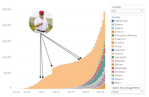The WHO status report on March 8 (above) showed the extent of the distribution of the virus with 105,586 confirmed cases in over 100 countries. [4] However, those grim statistics didn’t dissuade Trump from playing golf that day at Mar a Lago with members of the Washington Nationals. [5]